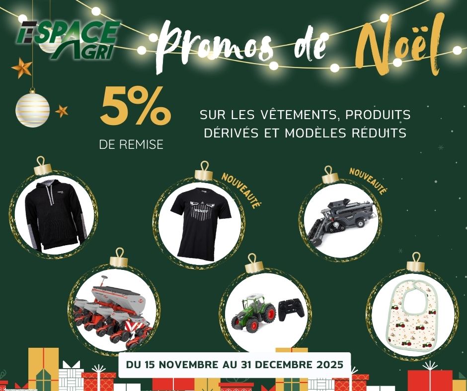 La magie de Noël arrive chez Espace Agri ! Pour vous remercier de votre fidélité et vous aider à préparer les fêtes, nous lançons deux opérations exceptionnelles : une remise immédiate de 5% sur une sélection d'articles et une Grande Tombola de Noël dans toutes nos concessions.